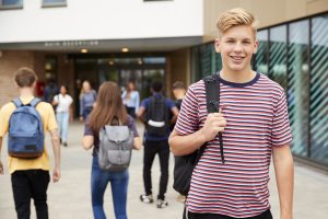 Terug Portrait Of Smiling Male High School Student Outside College Building With Other Teenage Students In Background